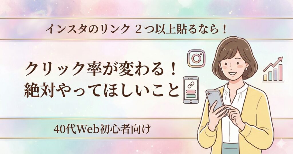 インスタのプロフィール、リンクがURLのまま並んでいませんか?2つ以上貼るなら「タイトル」設定が必須です。40代〜60代のWeb初心者の女性起業家向けに、クリック率を上げる設定方法をやさしく解説。動画と画像で迷わずできる4ステップをご紹介!「どれを押せばいい?」と迷わせず大切なお客様をあなたのサービスへ繋げましょう。
