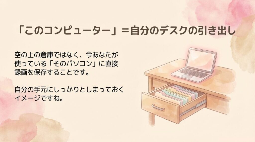 「クラウド」と「コンピューター」、この違いがわかるだけでも、録画ボタンを押す時のドキドキが少しだけ軽くなりますよね。
