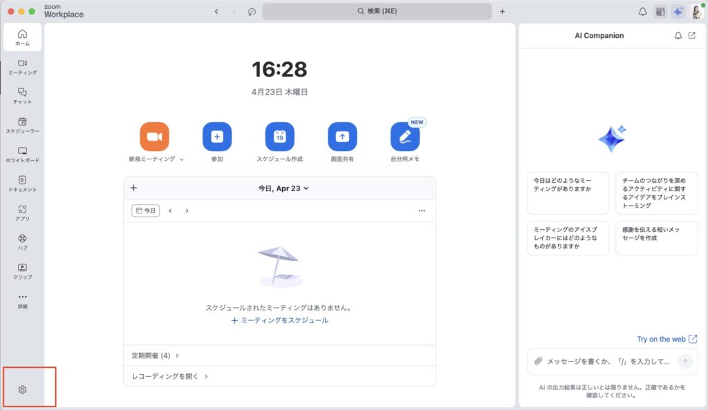 ①Zoomデスクトップアプリを起動し、左下の「設定(歯車アイコン)」をクリック。