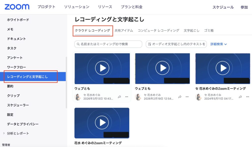 有料プラン(Pro以上)で「クラウドにレコーディング」を選択した場合や、