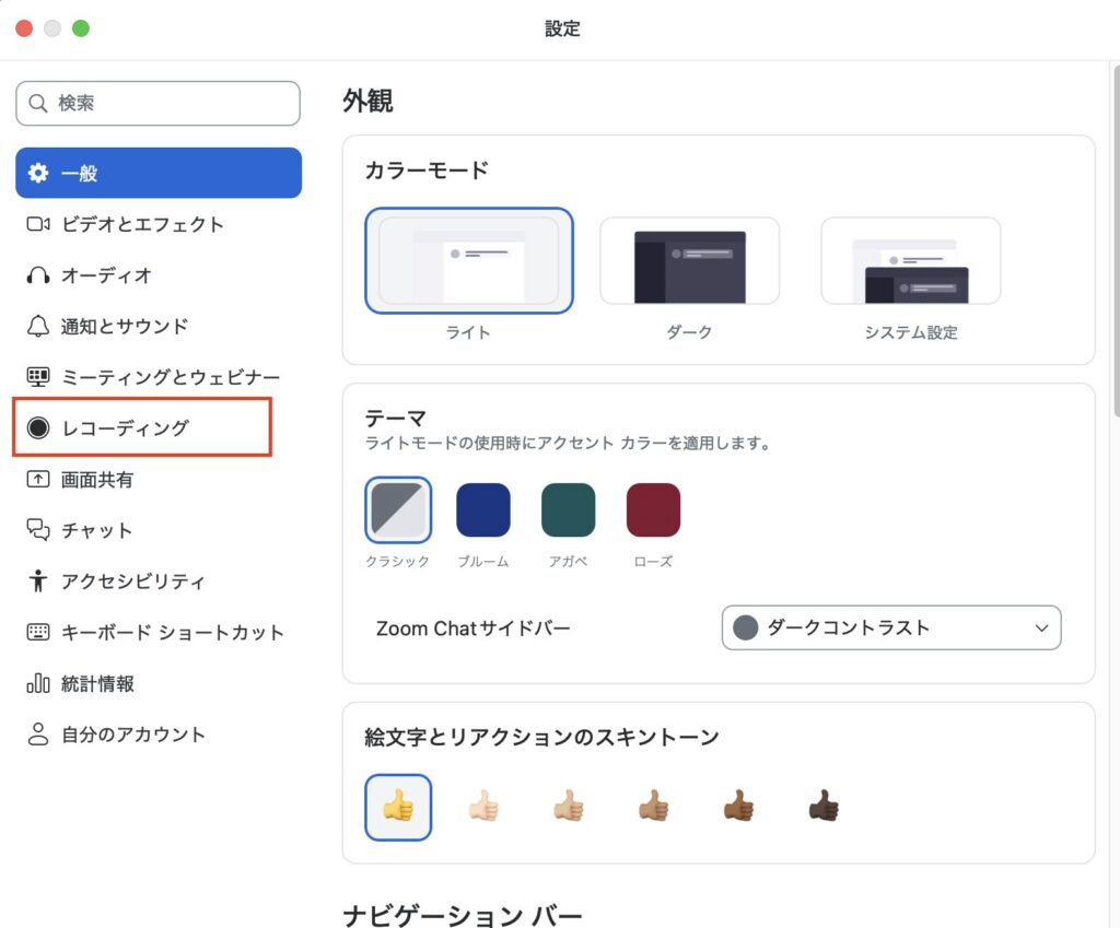 ①Zoomアプリの「設定(歯車マーク)」→レコーディング