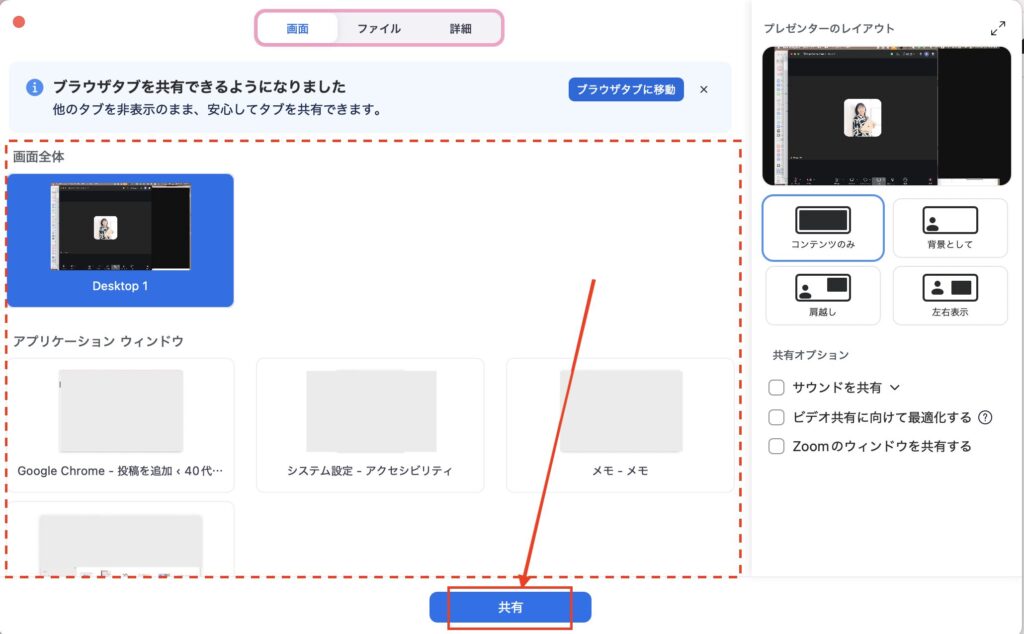 • 「アプリケーションウィンドウ」を選択: 選択した資料、アプリだけが映ります一番安全でおすすめです。