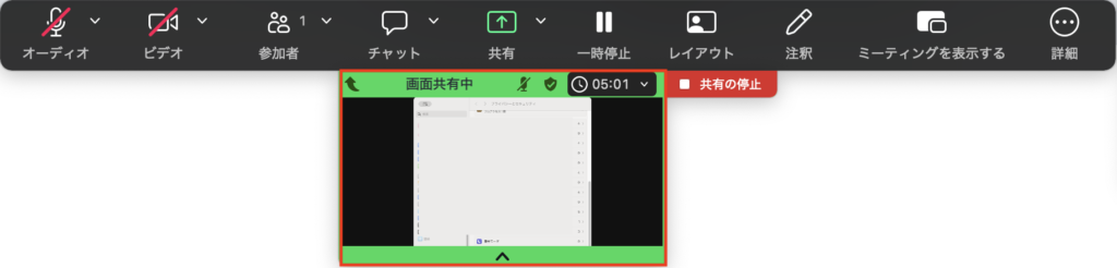 操作バーにある「画面共有中」という緑色のエリアに、小さなプレビュー画面が表示されます。